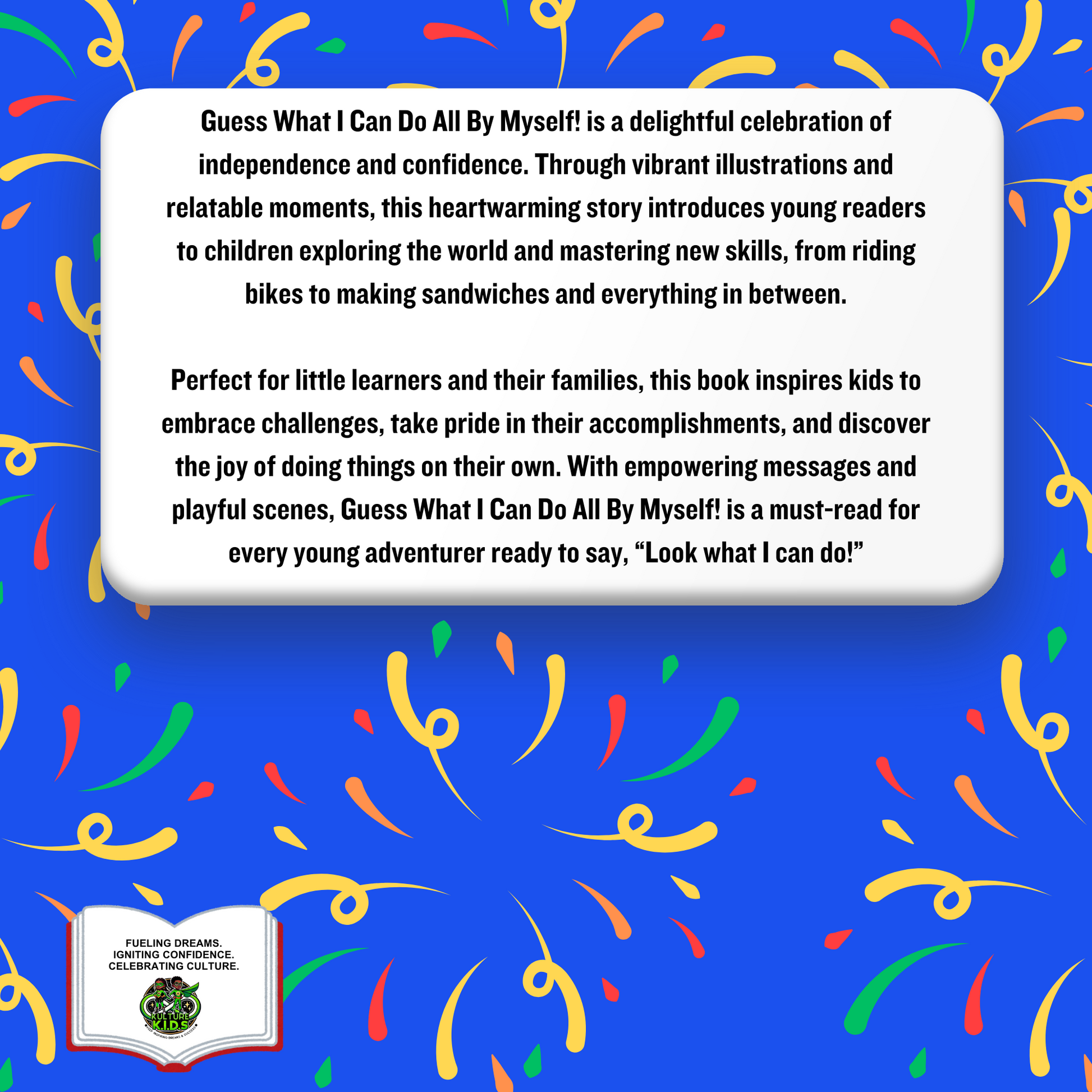 Perfect for little learners and their families, this book inspires kids to embrace challenges, take pride in their accomplishments, and discover the joy of doing things on their own. With empowering messages and playful scenes, Guess What I Can Do All By Myself is a must-read for every young adventurer ready to say, “Look what I can do!”
